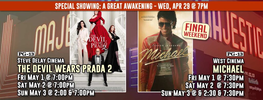 - Movies are for entertainment purposes and do not represent the viewpoints or opinions of the Majestic Theatre board.